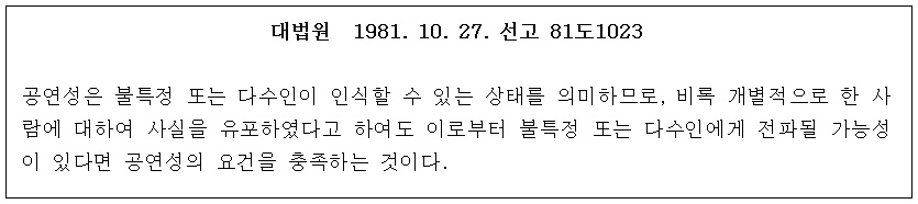 판례가 너무 오래 되었다고 생각하시는 분들을 위해 보충 설명을 해드리면, 위 판례는 공연성의 개념을 최초로 밝혀준 판례이며 이후에 대법원의 위 판례의 공연성 개념을 인용하여 판결을 내리고 있습니다(대법원 1981. 10. 27. 선고 81도1023을 인용한 대표 판례: 대법원 2000. 2. 11 선고 99도4579판결, 대법원 2006. 9. 22. 선고 2006도4407 판결).