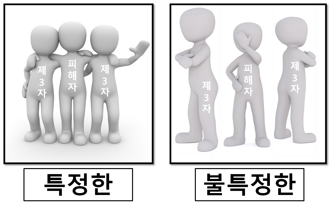 안타깝게도 대법원은 특정과 불특정을 구분 할 수 있는 기준이 '무엇이다'라고 명시하지 않았기 때문에 우리는 이전의 판례를 분석하여 그 뜻을 해석할 수 밖에 없습니다. 제가 여러 판례를 분석해본 결과 대법원은 피해자와 제3자가 친분이 있는 경우 특정하다고 보고 있으며, 피해자와 제3자가 친분이 없는 경우 불특정하다고 보고 있습니다(참고 판례: 대법원 1996. 7. 12. 선고 96도1007, 대법원 11991. 6. 25 선고 91동347, 1990. 12. 26. 선고 90도2473 등).